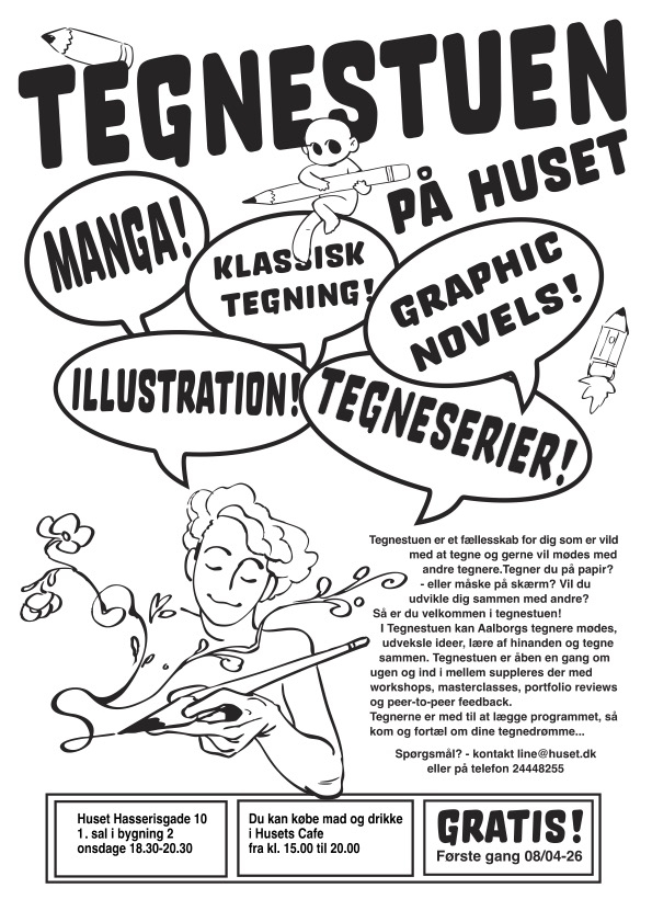 Vil du udvikle dig sammen med andre? Så er du velkommen i tegnestuen! I Tegnestuen kan Aalborgs tegnere mødes, udveksle ideer, lære af hinanden og tegne sammen.