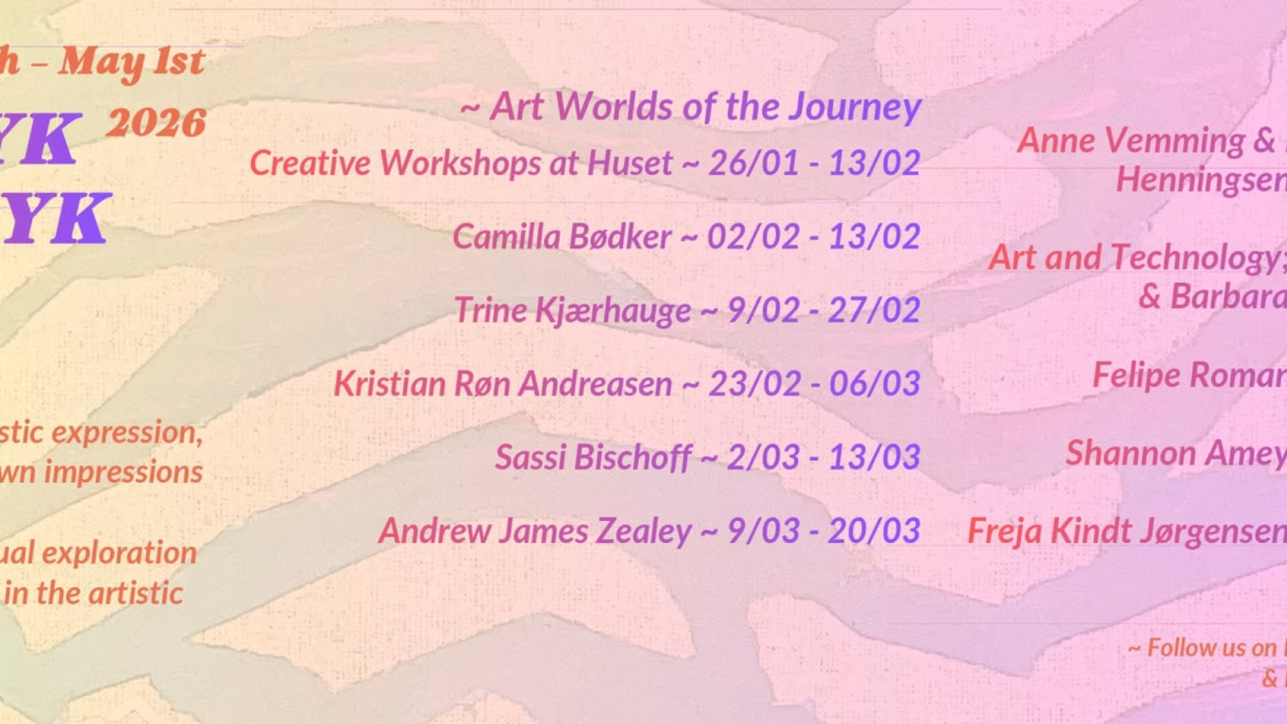 Og kom med på vores næste kunstrejse gennem det spirende vækstlag af nordjysk samtidskunst! Her kan du opleve 10 inspirerende udstillinger! Vi skal dykke ned i forskellige kreative, legende processer hos kunstnere med deres helt eget, unikke udtryk.